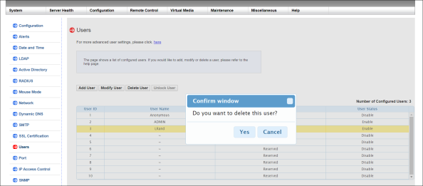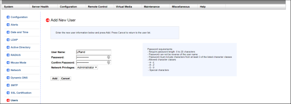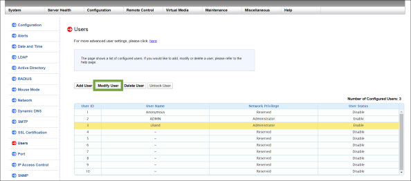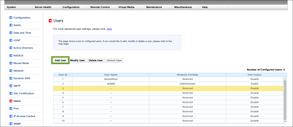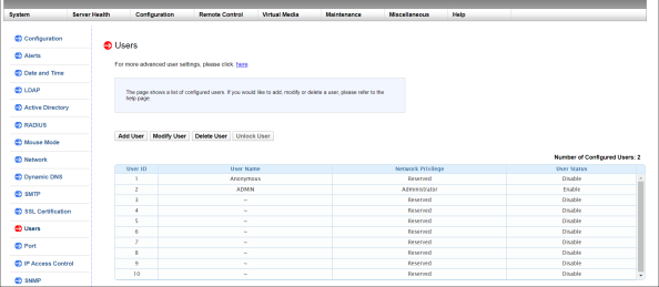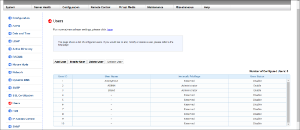 The BMC Web UI allows you to update the default admin user credentials and create additional users. The system can have up to ten users. Three types of users are available: