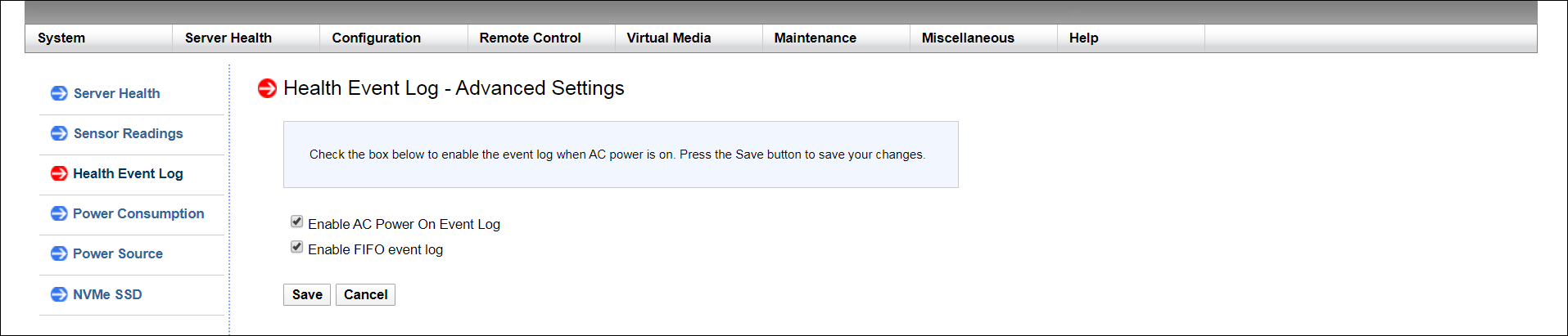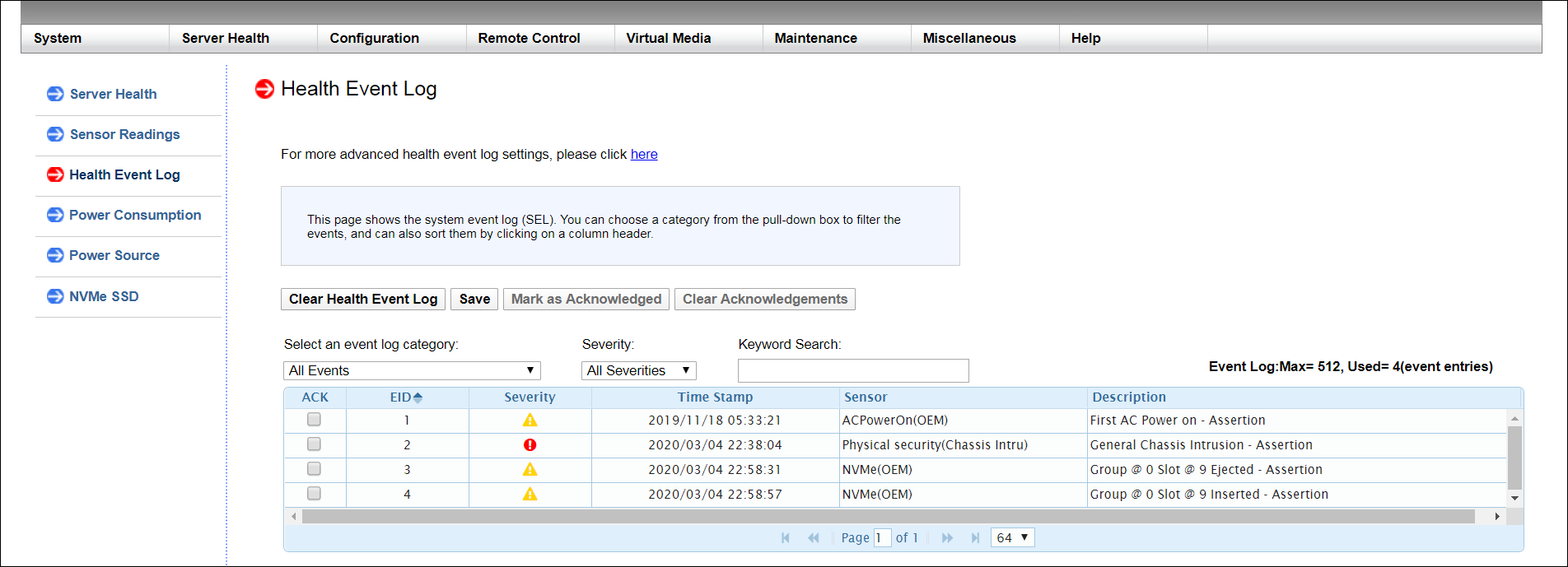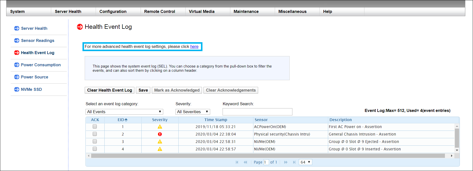 In the Submenu on the left, click Health Event Log to open the Health Event Log page. You can sort the data by column header, if needed.