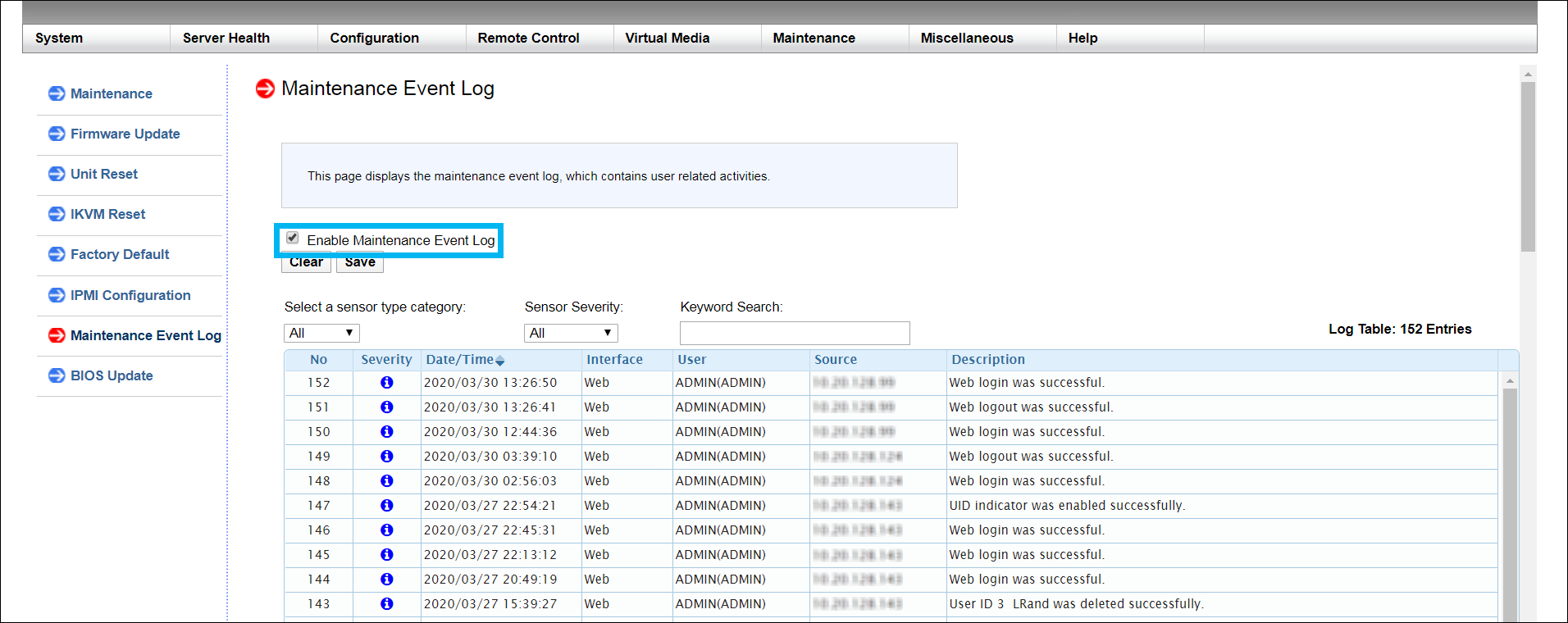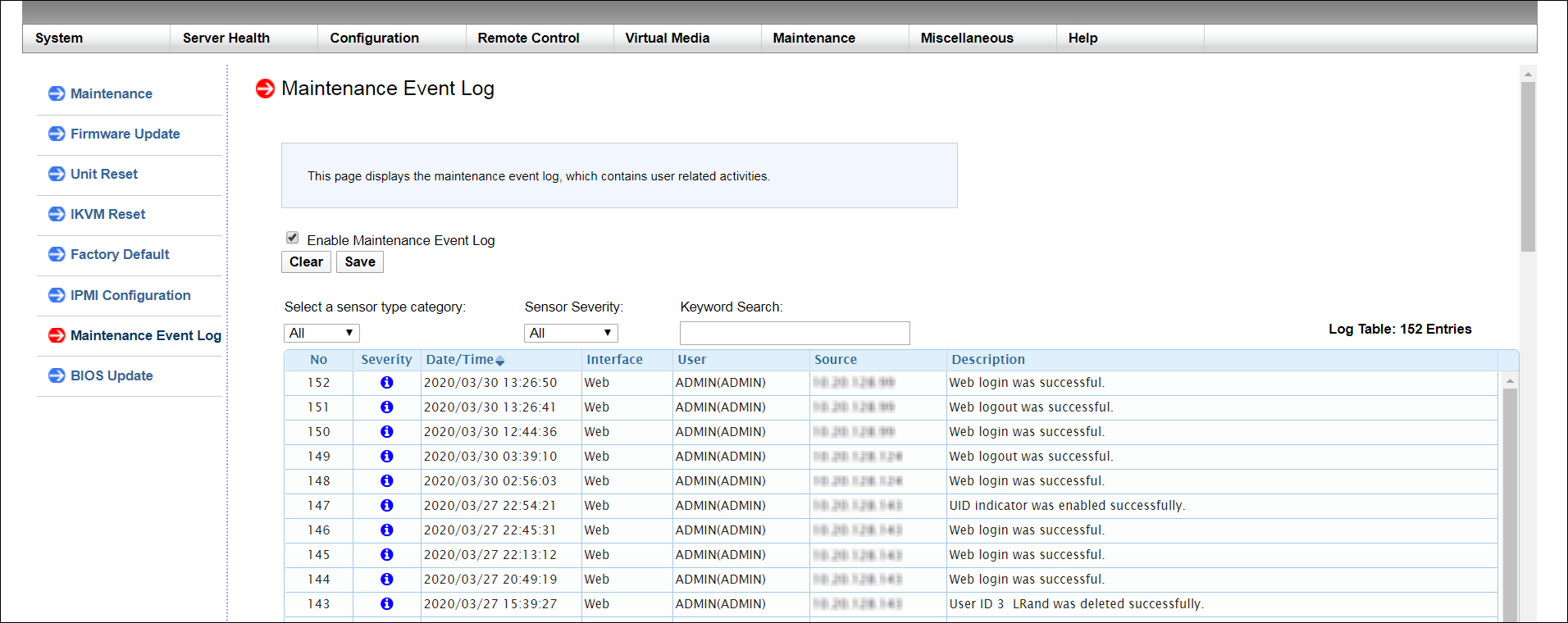 The Maintenance Event Log identifies who accessed the BMC Web UI, and the function the user performed. For example, each time a user logs into the BMC Web UI, the system saves the following: