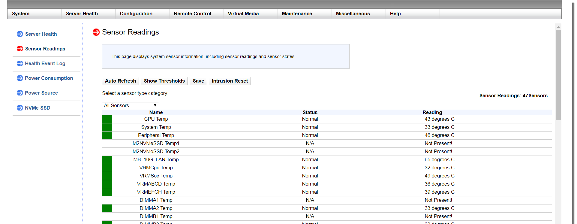In the Submenu on the left, click Sensor Readings to open the Sensor Readings page.