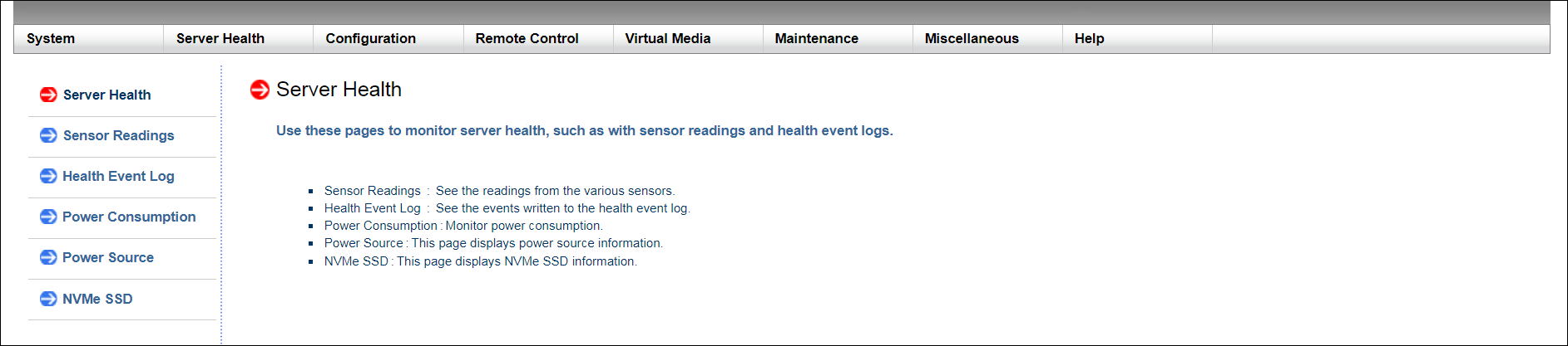 In the BMC Web UI, click Server Health in the Main Menu at the top of the page to open the Server Health page.