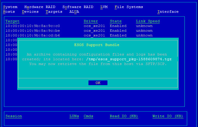 - Note the support bundle's name and location. Then, press Enter to indicate OK, and close the ESOS Support Bundle dialog box.