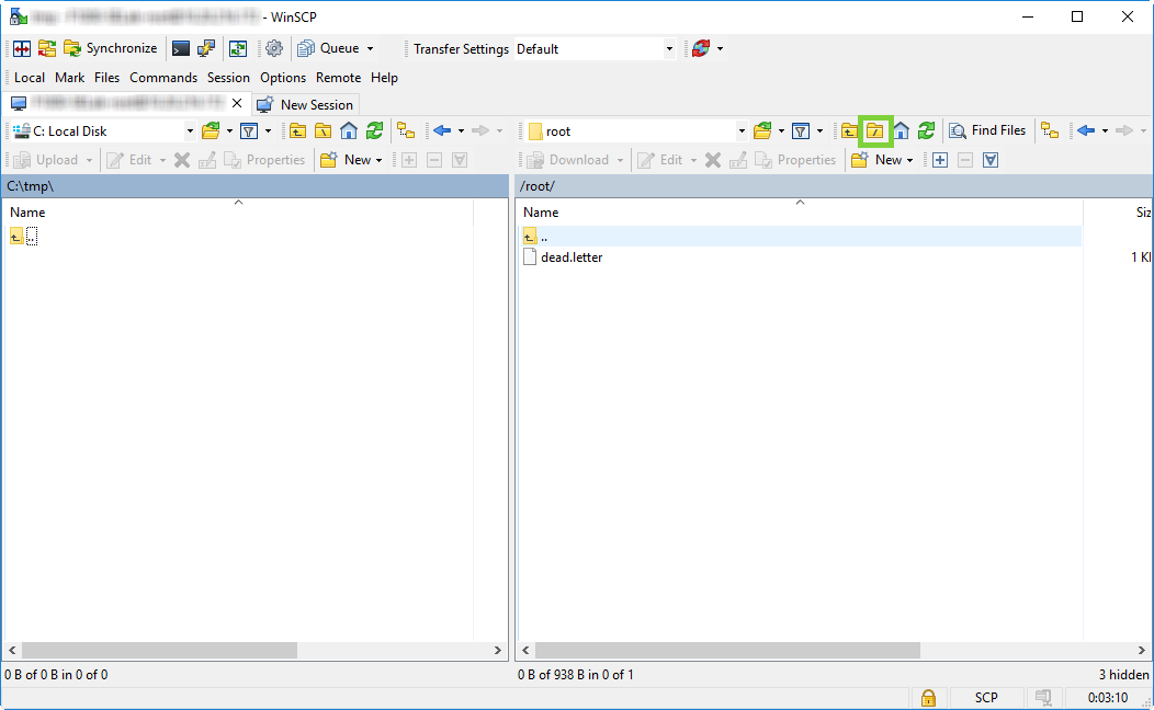 In the right pane of the WinSCP screen, click root directory to access to the root-level directory folder.