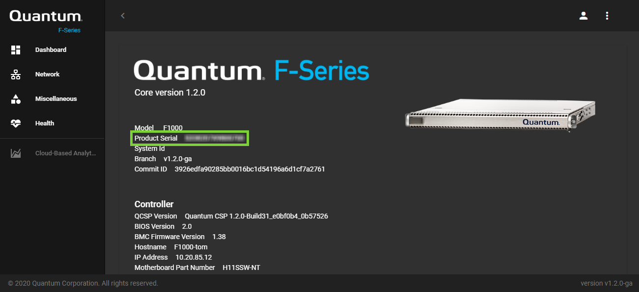 You will need your F1000 system serial number when you contact Quantum Technical Support. Use one of the following methods to locate the system serial number: