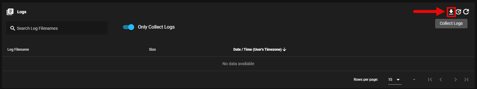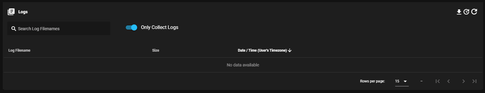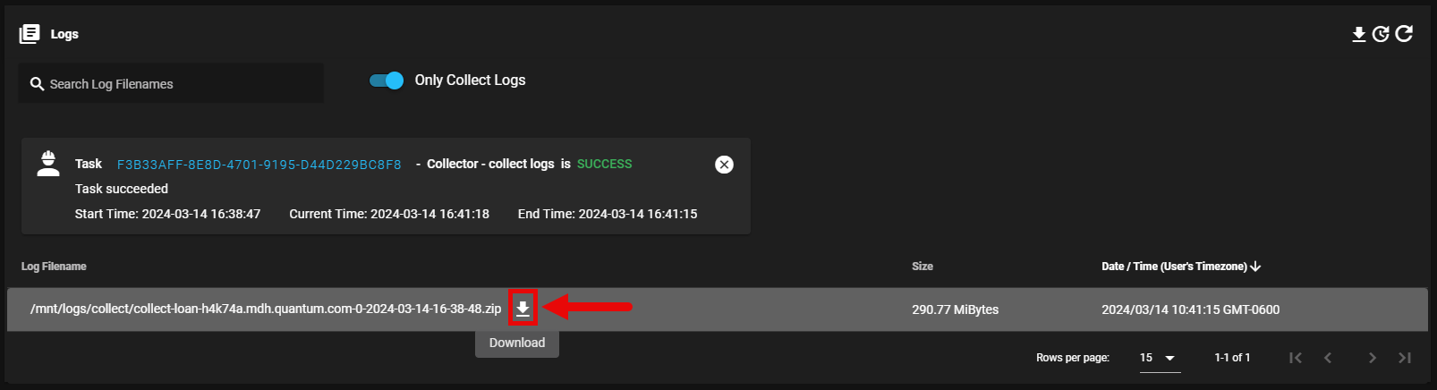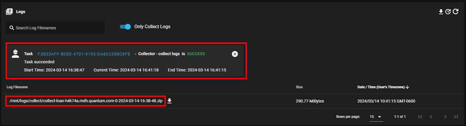 The log collection process begins. Verify the logs are collected successfully; the corresponding task is completed successfully and its log file bundle (.zip) appears in the table.