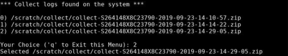 The system notifies you when it is done collecting data, and where you can find the resulting .zip file. In the example below, the system placed the file collect-S264148X8C23790-2019-09-23-14-29-05.zip in the following location: /scratch/collect.