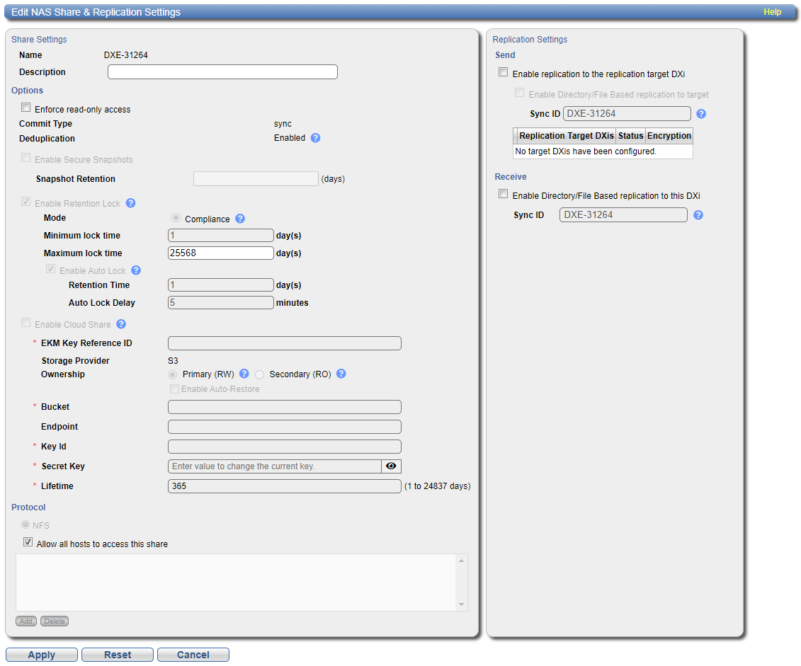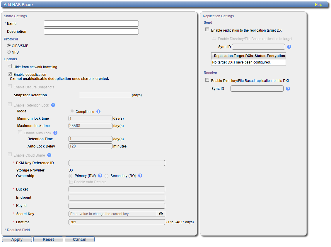 The NAS Summary page allows you to manage NAS shares on the DXi4800. You can view information about existing shares, add or edit shares, and delete shares.