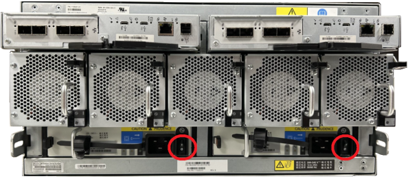 After the Node shuts down, remove power from the Array module(s). Press the power switch to the OFF position for each PSU.
