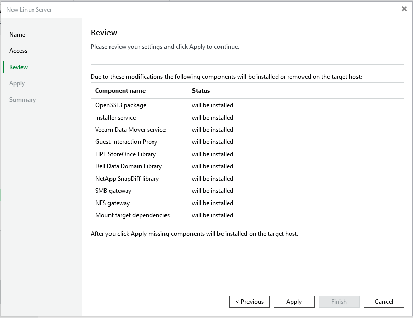 The New Linux Server dialog automatically moves to the Apply tab. This screen populates with all saved settings appearing in the Message box, as the backup repository is created and saved as configured.
