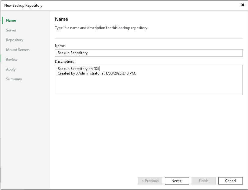 - Enter a Name and Description for the target repository In the Name section of the New Backup Repository dialog and click Next.