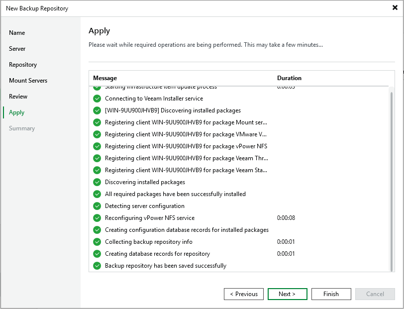 - When the Message list shows Backup Repository has been added successfully, click Next to continue.