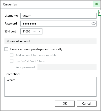 Enable access for the Veeam agent; either the password and or the key must be entered. The system will reboot if the enable state is changed. If only the password is changed, a reboot is not necessary. |