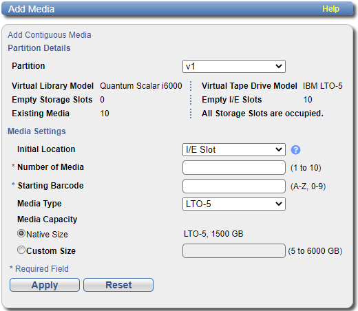 Use the Media Add page to add a contiguous range of virtual tape cartridges to a VTL partition. You can specify the initial location, starting barcode, media type, and media capacity. After the cartridges are created, they are available for backing up data.