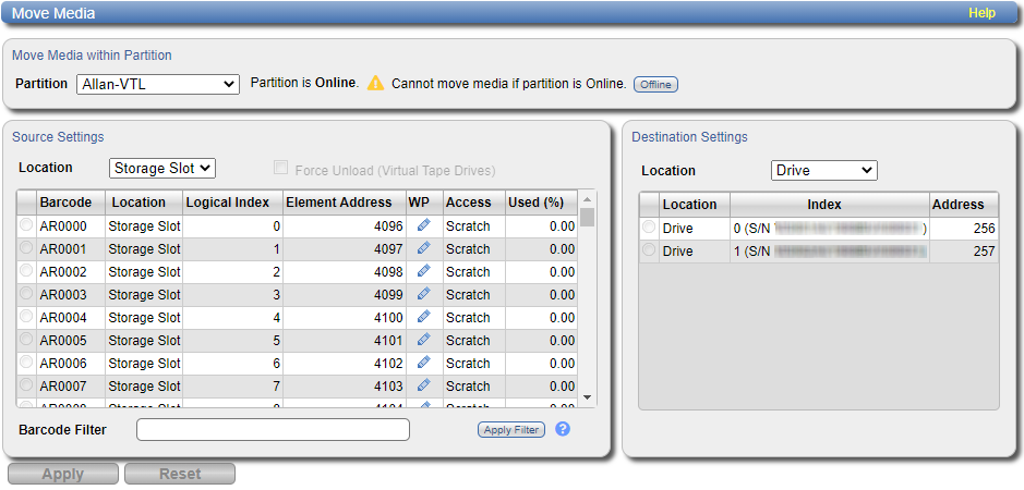 - If the partition is online, click Offline to take the partition offline. To move media, the partition must be offline.