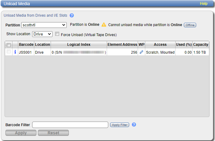 - If the partition is online, click Offline to take the partition offline. To unload media, the partition must be offline.