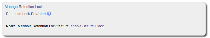 To see if retention lock is enabled or disabled on the system, go to Configuration > System > Immutable Storage. The Manage Retention Lock will indicate that it is enabled or disabled. If it is disabled, you must first enable Secure Clock (see Enable Secure Clock).