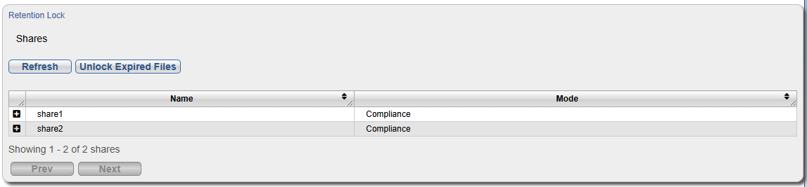 Under Retention Lock, select the NAS share you wish to unlock files by selecting the + icon next to the share. A list of all files in the share appears.