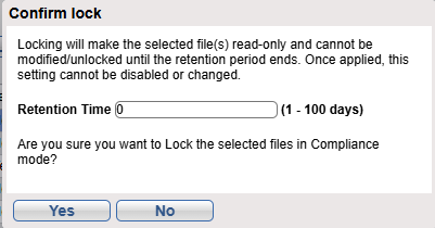 Click Yes. The selected file(s) will now have Retention Lock Enabled status of No and no retention lock Expiration Date.