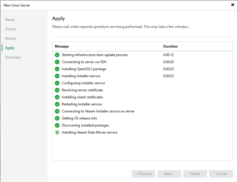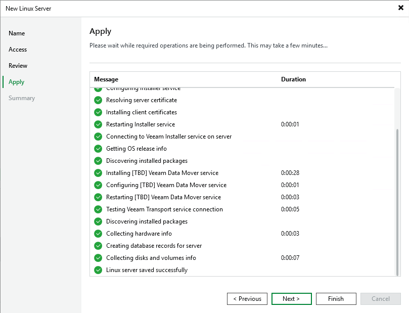 The New Linux Server dialog automatically moves to the Apply tab. This screen populates with all saved settings appearing in the Message box, as the backup repository is created and saved as configured.