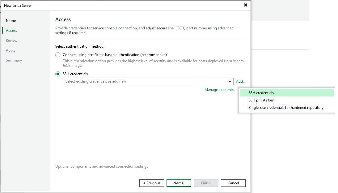 Click in the drop-down list in the New Linux Server dialog, select your newly-created credentials and click Next.