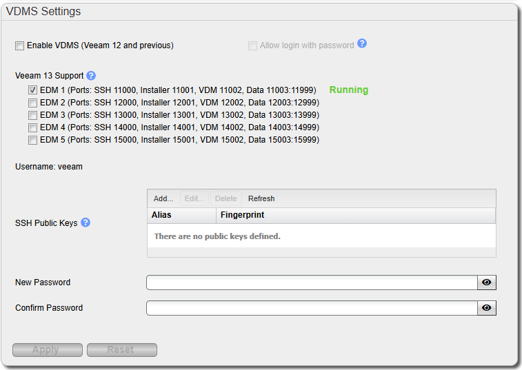Enable access for the Veeam agent; either the password and or the key must be entered. The system will reboot if the enable state is changed. If only the password is changed, a reboot is not necessary. |
