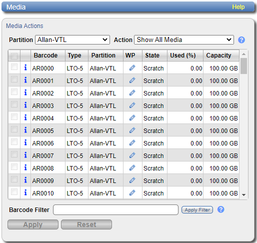 Export Removes a cartridge from the virtual media changer and places it in an exported state. Perform this action if an export cannot be performed from the backup application. The cartridge must be in the vaulted, scratch, or virtual state. Recycle Recycles (erases) a cartridge so it can be reused by the partition. Write Protect (WP) Enables or disables write protection for the cartridge. Import Media Imports cartridges into the currently selected partition. Cartridges that are in the exported or vaulted state can be imported from another partition with the same media type and data deduplication settings. After you select an action, the table is updated to show only the cartridges that support the selected action. Select Show All Media in the Action drop-down box to see all cartridges.
