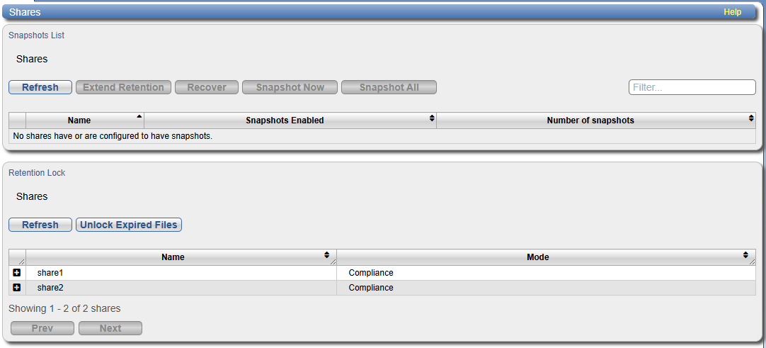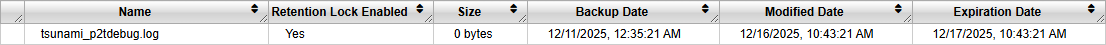 Name Name of file in the selected share. Retention Lock Enabled Indicates if retention lock is enabled on the file. Size File size. Backup Date Last time that the file was backed up. If you are using file retention autolock, you will want make the auto lock delay exceed the difference between the backup date and modified date. Modified Date Last time that the file was modified.