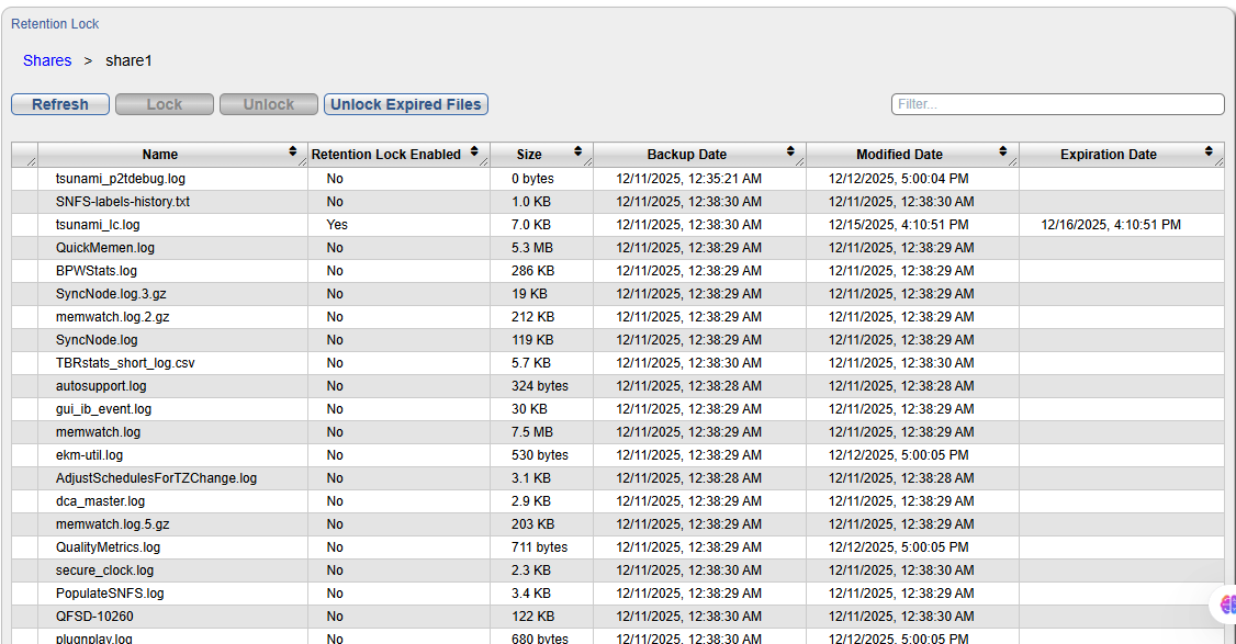 Under Retention Lock, select the NAS share you wish to unlock files by selecting the + icon next to the share. A list of all files in the share appears.
