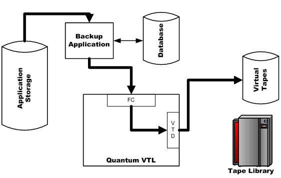 DXi contain partitions — or virtual tape libraries (VTLs) — that present the virtual media changer and virtual tape drives to the host exactly as they would to a physical tape library (PTL). This presentation allows the same drivers to be used for both VTLs and PTLs. Existing backup processes are identical, and creating a backup image on a virtual tape is no different from creating a backup image on a physical tape. The backup functionality and data path are unchanged.