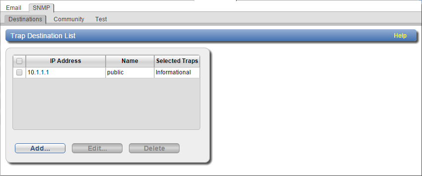 - From the DXi remote management console, select Configuration > Notifications > SNMP > Destinations to display the Trap Destination List page.