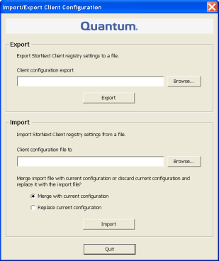 Import/Export Client Settings: Import or export StorNext registry settings from or to a file.