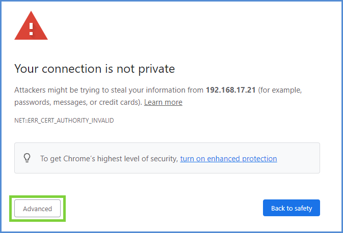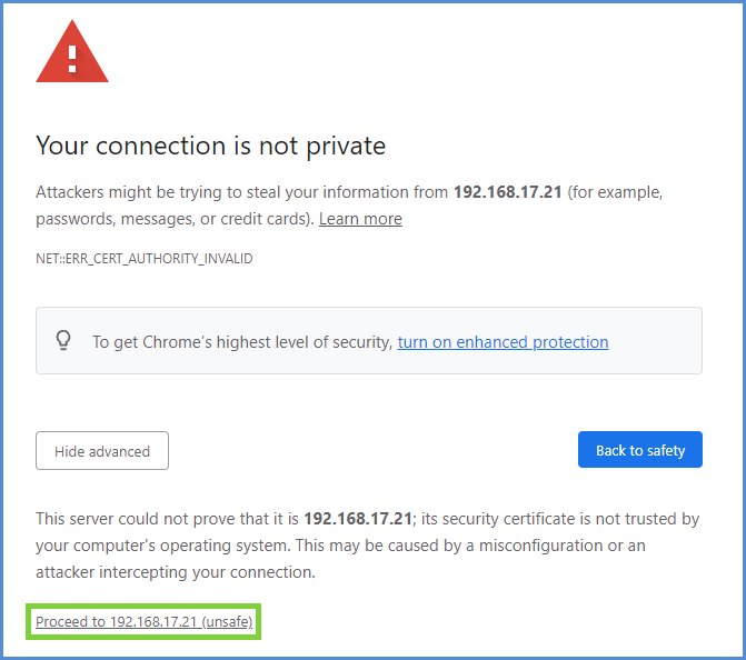 When you first use this address to launch the UUI, you might receive a notification in your browser about a missing local web site security certificate. The notification is benign and does not pose a security risk within your environment. Accept the notification and continue to the UUI.