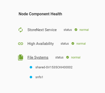 Click the icon to view health and status details about a node. This provides status information about the StorNext service, high availability, file systems, and web services.