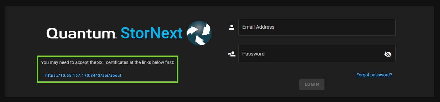 In the browser's address field, enter the IP address (or hostname) and the port number of the Quantum appliance that is hosting StorNext. On dual-node systems, this is the IP address (or hostname) of server Node 2. For example: