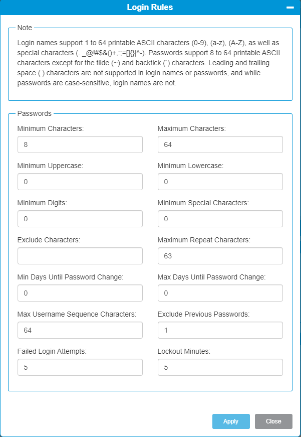 | Login Rules | Allows you to manually configure user password login rules. |