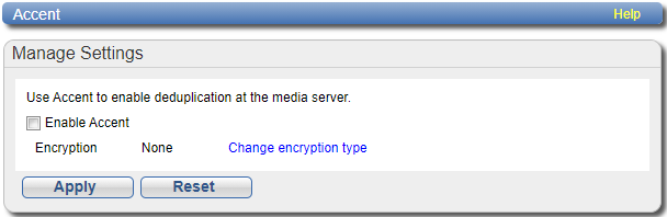 Use the Accent page to enable or disable Accent. Quantum’s Accent software accelerates backups and reduces network bandwidth requirements by distributing deduplication between the backup server and the DXi. OST data sent from the media server to the DXi can be encrypted using AES (Advanced Encryption Standard) encryption methods.