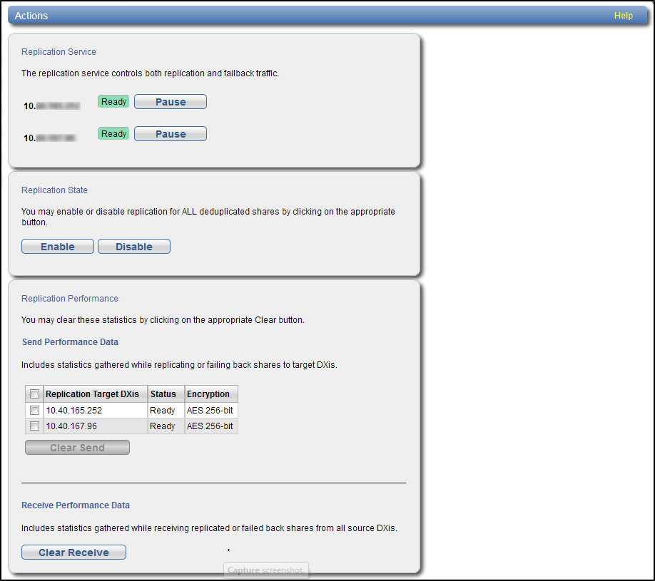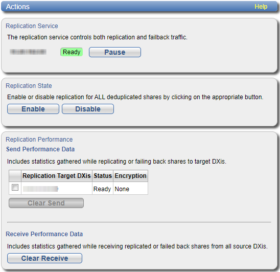The Actions page allows you to manage replication activity on the DXi. You can pause the replication service, enable the replication state, and clear performance statistics.