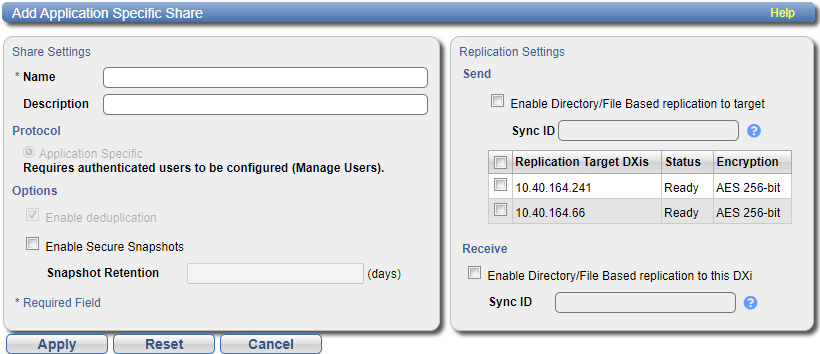 - Add a new Application Specific share to the system. See Adding an Application Specific Share.