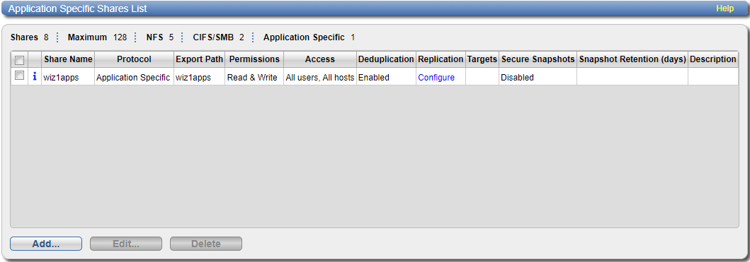 The Application Specific Shares page allows you to manage application-specific shares on the DXi. You can view information about existing shares, add or edit shares, and delete shares.