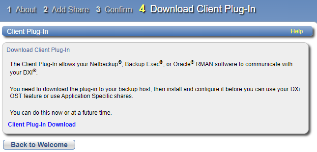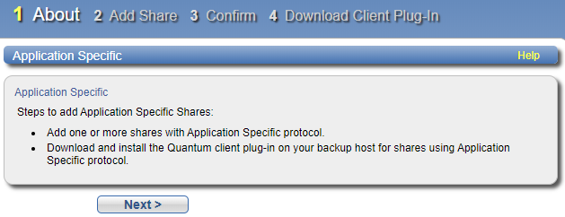 The Application Specific wizard provides guided assistance for configuring the DXi to use application-specific shares to be used by RMAN or AccentFS. A link for downloading and installing a Client Plug-in on your backup host is provided in the Confirm step.