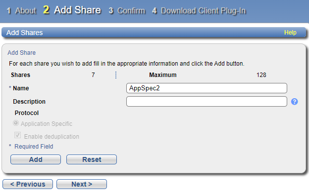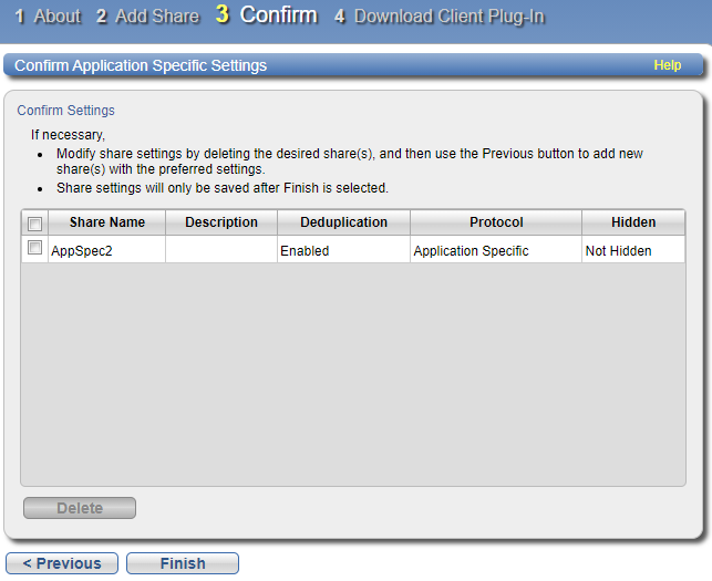 - To make changes to an Application Specific share you added, first select the share and click Delete to delete the share. Then click Previous to return to the previous step and add a new share.