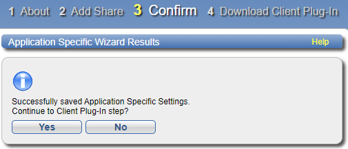 - When you click Finish, the Application Specific Wizard Results screen confirms that your settings are saved. Click on Yes to continue in the wizard to the Download Client Plug-in step or No to finish the Wizard.