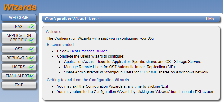The Configuration Wizards provide guided assistance for setting up the DXi. Use the wizards to quickly configure the most important features of the system, including storage presentation and data replication. Each wizard leads you step-by-step through the configuration process.