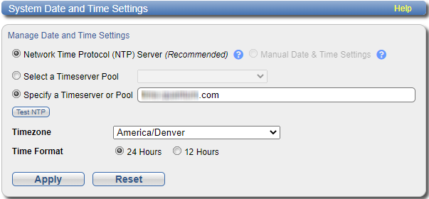 - Specify a Timeserver or Pool - Type the name or IP address of the NTP server or pool. See http://support.ntp.org for information about publicly available NTP servers.