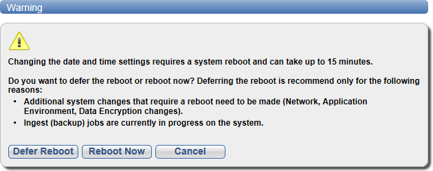 Deferring a reboot is only recommended if additional system changes that require a reboot need to be made (Network, Application Environment, Data Encryption changes) or ingest (backup jobs) are currently in progress on the system.
