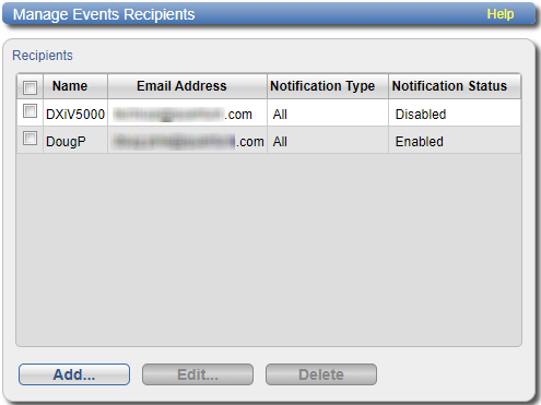 The Recipients page allows you to manage the e-mail recipients for the DXi to send notifications. You can add, edit, and delete e-mail recipients, and you can specify the types of notifications to send.