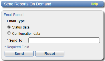 The Send Reports On Demand page allows you to manually generate a status data or configuration data report. The report is immediately sent to the specified email recipient. You can also view configuration data.