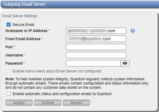 Note: Automatic emails contain configuration and status information only, and do not contain any customer data stored on the system.