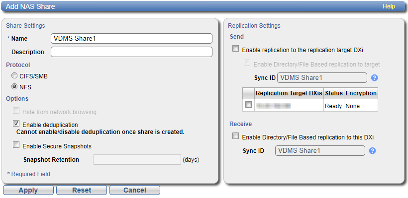 Add a NAS share to present the storage capacity of the DXi as a NAS share that is compatible with standard backup applications. You can add up to 128 shares. When you add a share, you must specify whether it uses the NFS protocol (for Linux networks) or the CIFS/SMB protocol (for Windows networks).