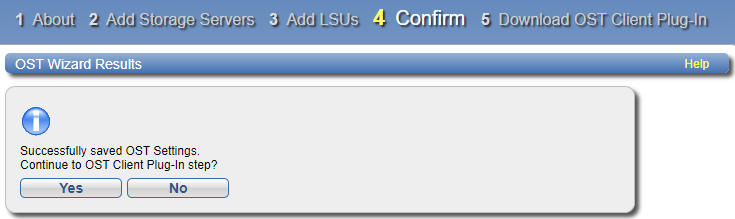 - When you click Finish, a confirmation screen appears, confirming that your OST setting are saved. To continue in the wizard and download the OST Client Plug-in, click Yes, or click No to return to the Wizards Welcome screen.
